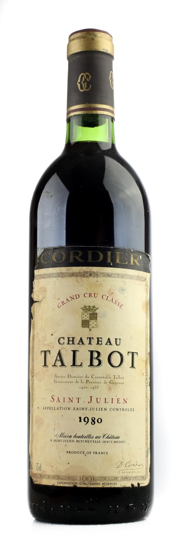 C'est sur le plateau de Saint-Julien-Beychevelle que l'on aperçoit de loin le Château Talbot, au bord dun océan de vignes, entre les grands arbres de son parc. Lhistoire de ce cru est riche. Il porte le nom du Connétable Talbot, célèbre homme de guerre anglais, gouverneur de Guyenne, vaincu à la bataille de Castillon en 1453. En 1855, lors du classement des crus du Médoc et des Graves commandé par l'Empereur Napoléon III, le Château Talbot est promu quatrième cru classé de Saint-Julien. Après avoir été la propriété des marquis dAux pendant plusieurs décennies, le domaine est acquis en 1917 par Désiré Cordier. Son fils Georges puis son petit-fils Jean et enfin les deux filles de celui-ci, Lorraine Cordier (décédée en avril 2011) et Nancy Bignon-Cordier, se sont succédé à la destinée de cette propriété. Sous leur impulsion, Talbot sest imposé comme lun des crus les plus célèbres du bordelais. Au total, les 107 hectares du vignoble du Château Talbot sétendent tout autour de la demeure jusquaux frontières nord de lappellation, à la limite de Pauillac. Plantés sur un terroir de fines graves günziennes sur socle de calcaire à astéries, formant des croupes drainantes, on y trouve une grande majorité de vignes rouges (102 hectares) et une confidentielle superficie de vignes blanches (5 hectares). La tenue du vignoble fait partie des plus irréprochables du médoc. Les vins, vinifiés avec les précieux conseils de l'nologue Jacques Boissenot et du consultant Stéphane Derenoncourt, sont régulièrement opulents mais de grande élégance. Leur caractère ouvert et leurs tanins soyeux permettent de les déguster jeunes comme après une longue garde en cave. Avec le temps, ils développent un bouquet aromatique délicat et complexe de cèdre et de havane. A noter une petite production d'un vin blanc sec délicieux, le château Talbot Caillou Blanc.