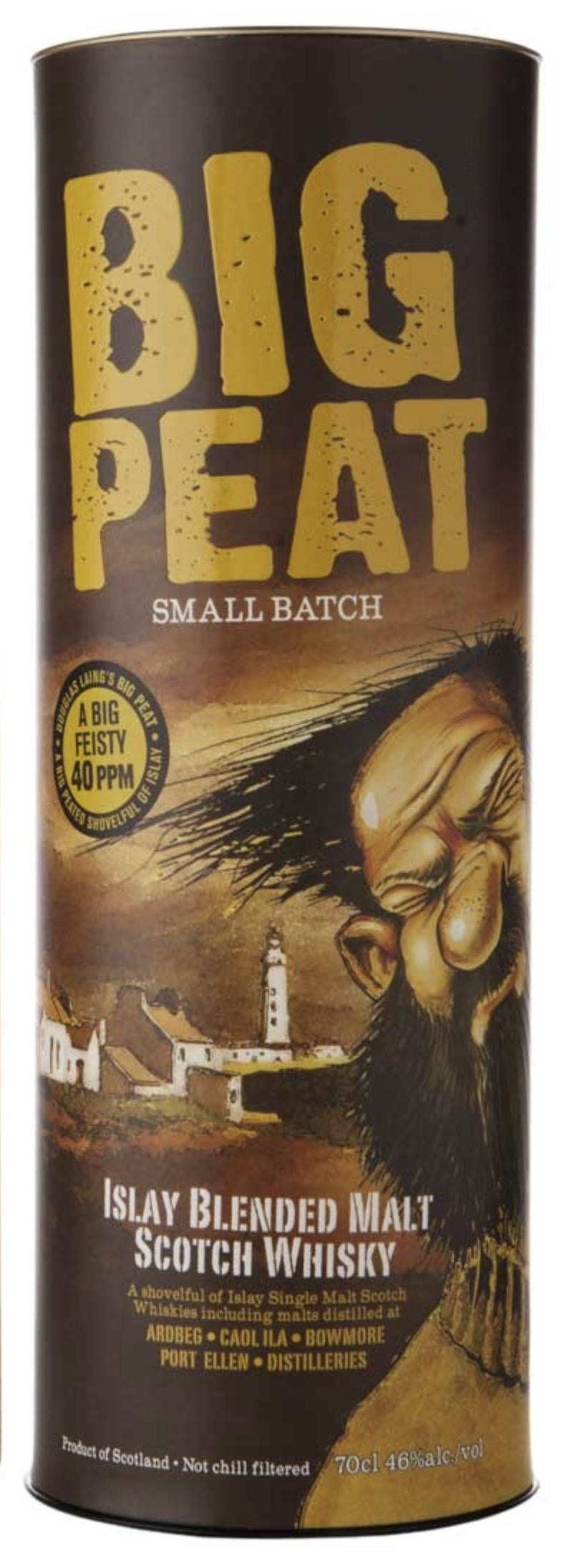 Celebración de la isla de Islay, de su gente, su clima y su whisky, Big Peat se embotella sin filtración en frío y ahora viene en tres tamaños: pequeño, mediano y grande, para satisfacer a los fanáticos. hasta los que no tienen miedo!
