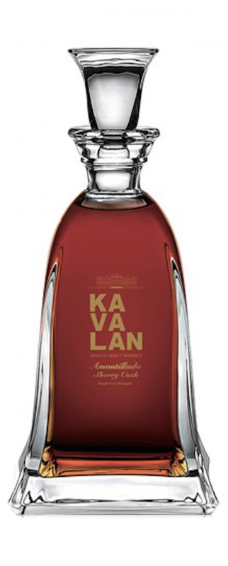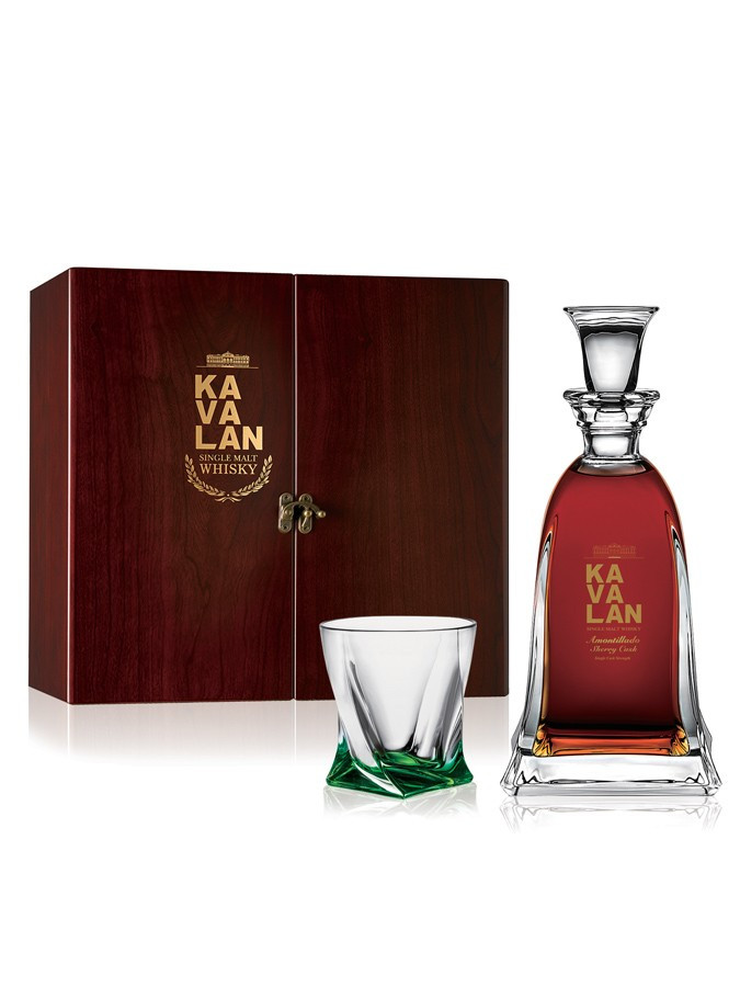 Voted the Best Single Cask and Single Malt in the World at the World Whiskeys Awards 2016, Kavalan Amontillado Cask is presented here in a prestigious box containing a carafe and a whiskey glass.