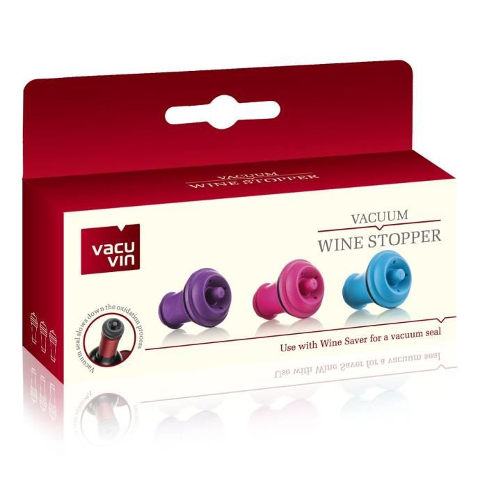 Set de 3 bouchons stoppers - Bouchon en élastine thermoplastique, Dimensions : 4 x 3,5 x 3,5 cm, Ne convient pas pour, les vins mousseux, Bouchon ré-utilisable convient au goulot, de toutes les bouteilles de vin, habituelles, Couleur : bleu, rose, violet