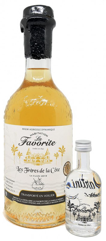 Tato cuvée 2019 od La Favorite je krásným příběhem mezi společností Frères de la Côte (velmi známou pro svůj plachetnicový transport a dynamické zrání rumu) a palírnou La Favorite. Po 7 měsících odpočinku a pomalého ředění byl tento zemědělský rum z roku 2018 pečlivě připraven na mimořádnou cestu. V únoru 2019 byly sudy s bílým rumem naplněny do 5 dubových sudů, které dříve obsahovaly bourbon. Již druhým rokem po sobě se plachetnice Tres Hombres zastavila na Martiniku, aby naložila do svých prostor chutě našeho krásného ostrova květin. Během 6 měsíců plavby výhradně na plachty toto jedinečné složení získalo dynamické zrání, které mu dodalo významný aromatický vývoj a krásnou zlatavou barvu.