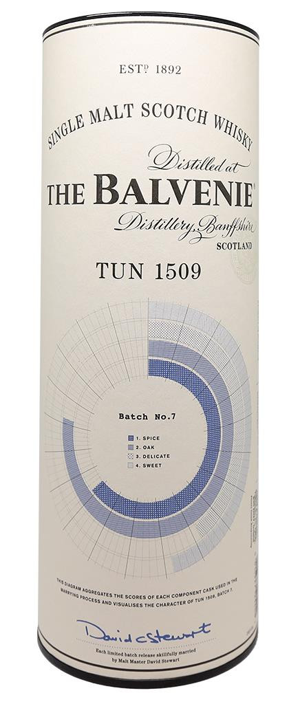 As primeiras engarrafamentos da série "Tun" foram nomeadas em homenagem ao tanque de mistura preferido de David C. Stewart MBE (Tun 1401), e cada série subsequente foi nomeada de acordo com o barril no qual o uísque foi misturado. A cada ano, David cria um novo lote que reúne alguns dos melhores barris dos arquivos da destilaria. A sétima versão do Balvenie Tun 1509 é uma combinação de 21 barris cuidadosamente selecionados - 4 barris de carvalho americano, 10 Sherry butt (480-520 litros) e 7 hogsheads (250 litros) - que passaram três anos no tradicional tanque de mistura Tun 1509.