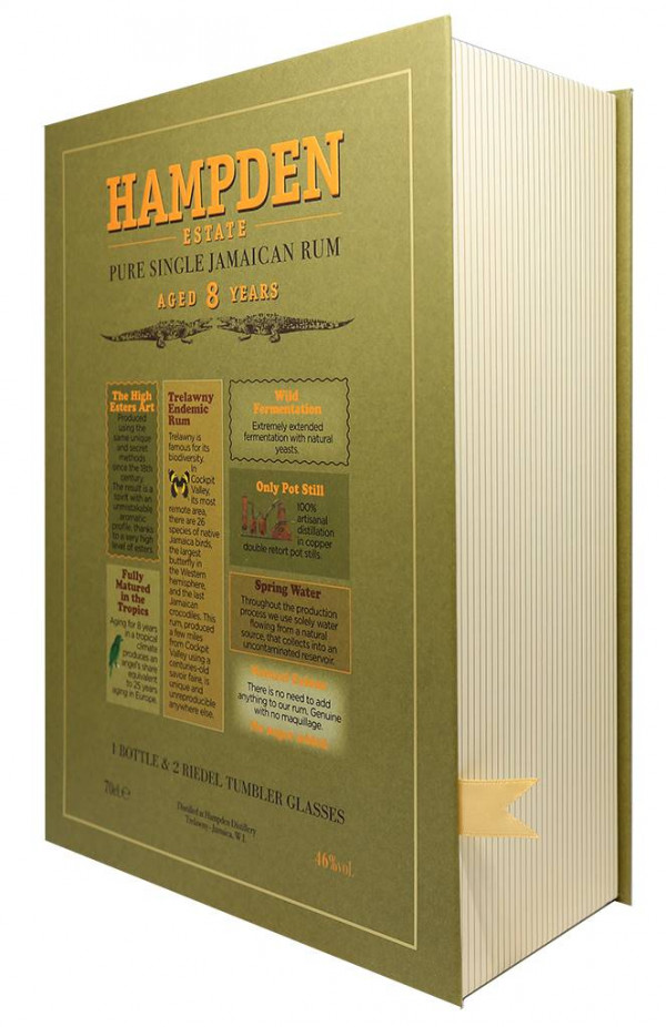 Dieser 8 Jahre alte Melasse-Rum ist ein OWH (Outram W Hussey), dessen Esterrate zwischen 40 und 80 Gramm pro Hektoliter variiert. Es wird in einer "Buch" -Box mit zwei Brillen der Marke Riedel präsentiert .