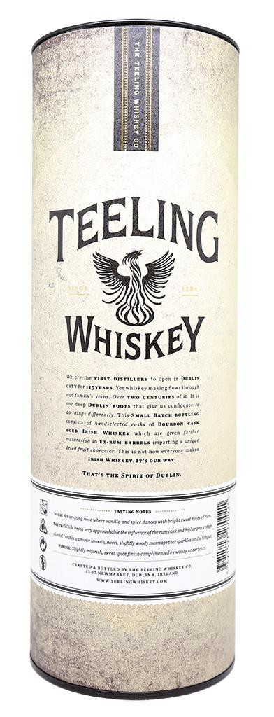 Teeling Small Batch er lavet af nøje udvalgte fade med korn- og maltwhisky, som oprindeligt er fuldt lagret i bourbonfade, og derefter samlet i centralamerikanske romfade i op til 12 måneder.