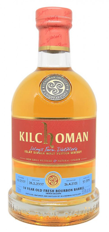 Til ære for Feis Isle har Kilchoman og LMDW-teamet udvalgt 3 enestående fade i 2021, specifikt til Frankrig. Denne 14 år gamle Single Cask kommer fra et af destilleriets ældste fade. Det er et ex-Bourbon fad fyldt med destillat lavet af kraftigt tørvemaltet malt med 50 ppm. Begrænset udgave på 240 flasker.