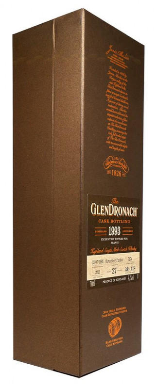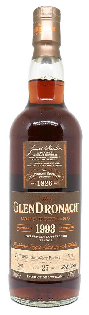 Este Glendronach , destilado en 1993 , fue envejecido en una sola barrica (puncheon) por Sherry Oloroso (número 7274). Se embotelló en 2021 y se produjeron 674 botellas.