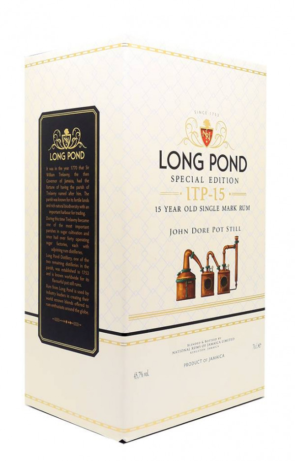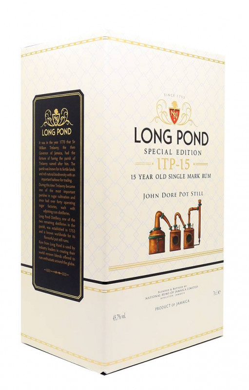 For første gang i National Rums of Jamaicas historie udgiver de deres første officielle aftapning for Long Pond. Denne Long Pond 15 år, kaldet ITP-15 for Ive Trelawny Pot, har en esterprocent mellem 90 og 120. En 15 år gammel rom, destilleret 100% i det ikoniske John Dore Pot Still fra huset. Den er aftappet ved 45,7%. Kun 504 flasker til Frankrig.