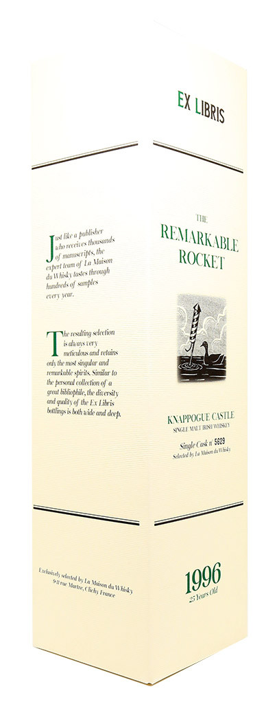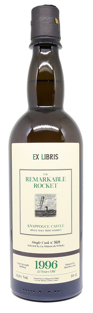 Knappogue Castle "The Remarkable Rocket" is a 25-year-old whiskey distilled in 1996. After a triple distillation, this Single Malt is aged in a Bourbon cask. This single cask (#5629) produced 200 bottles.