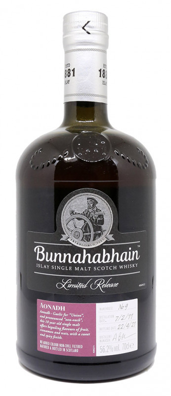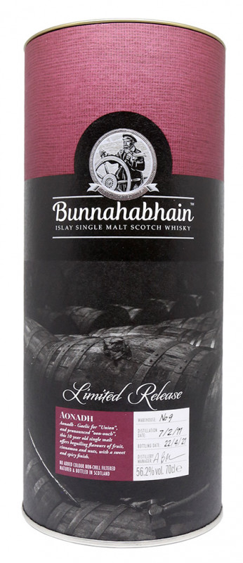 Aonadh (gaélique pour « Union » prononcé « Oon-ouch ») est un Single Malt de 10 ans d’âge distillé le 7 février 2011 et mis en bouteille le 22 avril 2021. Cette version est un mariage de Bunnahabhain affiné en fût de Porto et de malt entièrement mûri dans des fûts de Sherry qui ont été réunis après maturation. 14.088 bouteilles ont été produites.