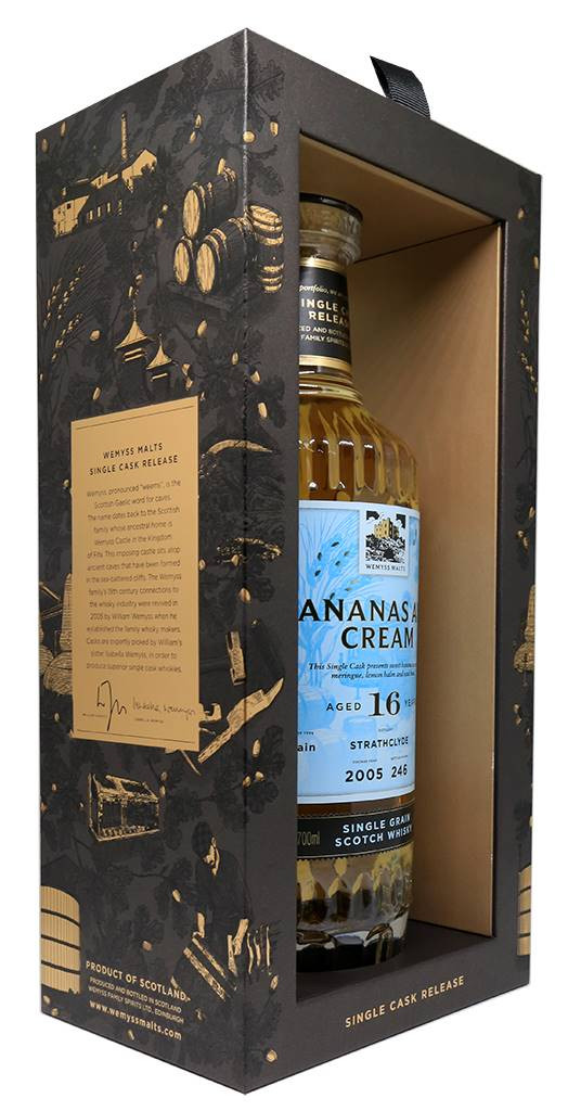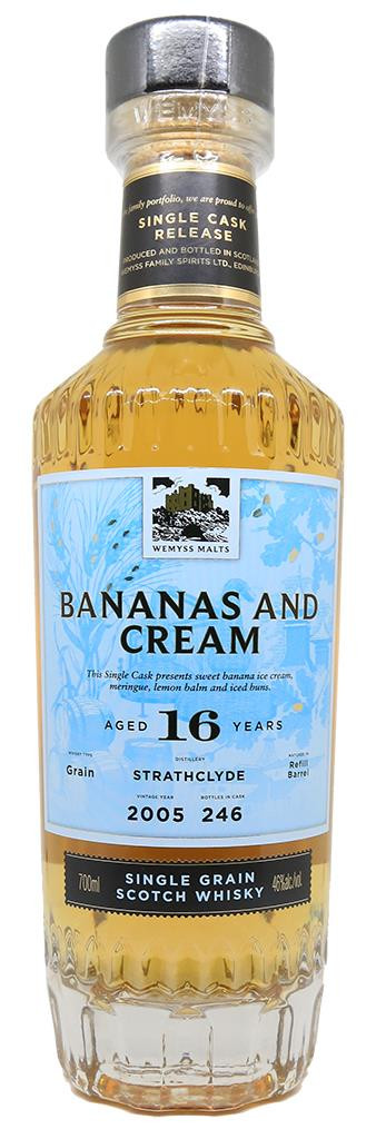 Bananas and Cream blev destilleret i 2005 af Strathclyde Distillery. Strathclyde destilleriet ligger i Gorbal-kvarteret i Glasgow, Skotland. Det er en Single Grain Whisky, hvilket betyder, at den kun kan fremstilles af fire ingredienser: vand, maltet byg, hele korn og gær. Den er derefter lagret i 16 år af familien Wemyss på refill-fade. 246 flasker blev produceret.