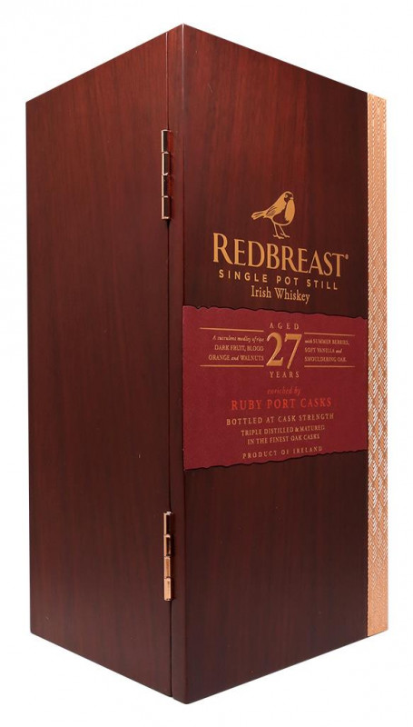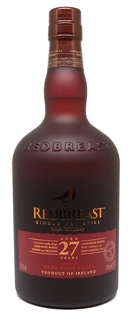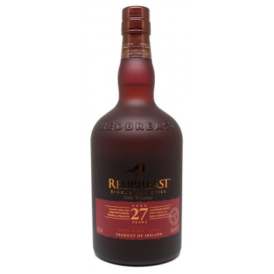 Redbreast 27 Year Old es la versión permanente más antigua de la gama Redbreast. El whisky se elabora exclusivamente a partir de whiskies Pot Still que han sido triplemente destilados y luego envejecidos en las mejores barricas de Bourbon, Sherry y Ruby Port .