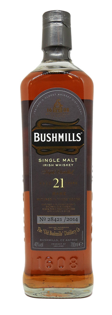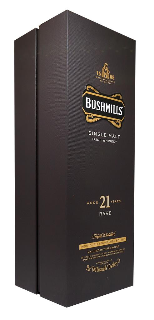 Bushmills 21 jaar is een blend van Single Malts die minimaal 19 jaar gerijpt zijn in zorgvuldig geselecteerde Sherry Oloroso-vaten en Bourbon-vaten, en vervolgens nog twee jaar gerijpt in Madeira-vaten.