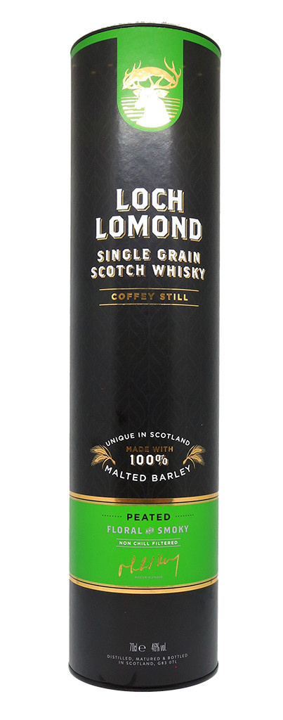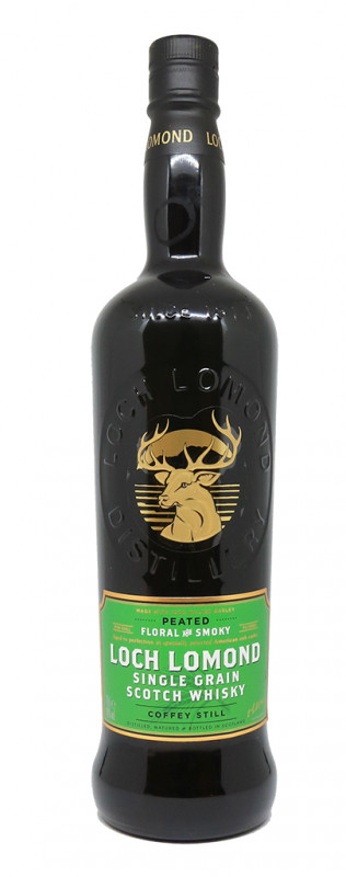 Loch Lomond Single Grain Peated está hecho completamente de cebada malteada y turba, destilada en un alambique de café. Tiene una crianza de 4 a 5 años en barricas de roble americano.