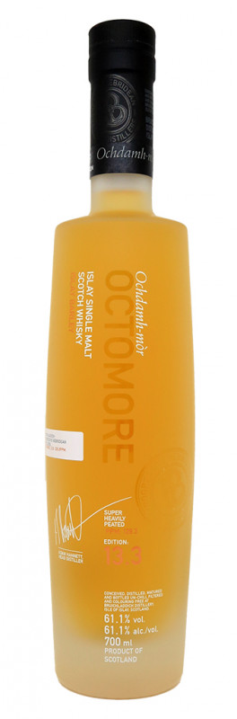 Octomore 13.3 byl destilován v roce 2016 z úrody 2015 skotského ječmene Concerto pěstovaného na farmě Octomore. Whisky zrála 5 let v kombinaci amerických sudů po ex-whiskey prvního naplnění a evropských dubových sudů druhého naplnění: Rivesaltes (Francie) a Ribera del Duero (Španělsko).