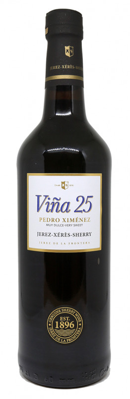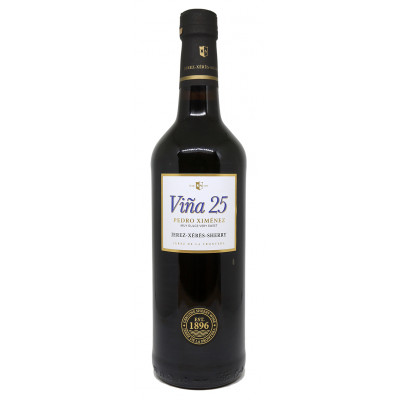 Viña 25 Pedro Ximénez é elaborado com a casta Pedro Ximénez. As uvas foram expostas ao sol após a colheita até que estavam praticamente passas. Depois disso, a fermentação começa lentamente e é interrompida para preservar todos os açúcares naturais. O vinho resultante envelhece em contato com o ar em Jerez de la Frontera. Os aromas deste jerez muito doce lembram figos, passas e tâmaras. Combina perfeitamente com queijos azuis fortes ou com sobremesas. Ideal como digestivo ou servido sobre sorvete de baunilha.