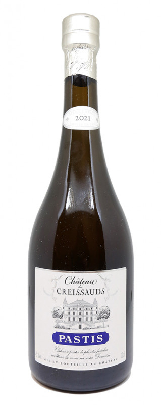 Pastis från Château des Creissauds tillverkas av färska växter från egendomens 7 hektar. Dessa aromatiska växter kompletteras med medelhavsväxter odlade i Châteauets aromatiska trädgårdar. Efter manuell skörd som sträcker sig från april till oktober, läggs växterna i maceration i Dame-Jeanne i fin alkohol. Varje växt macereras separat innan de blandas ihop och lagras i ekfat i ett år. Destillatet tappas sedan av, och lakrits och anisessens tillsätts innan slutlig utspädning till önskad styrka.