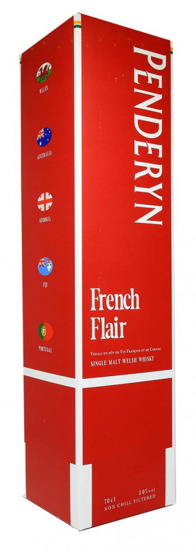 Penderyn French Flair is a limited edition produced as part of the 2023 Rugby World Cup . The whiskey is aged for 6 years in French wine barrels from the Cadillac region, then 4 years in Cognac barrels . On the box, we find the names of the countries in the same group as Wales: Fiji, Australia, Georgia and Portugal. 600 bottles were sold.