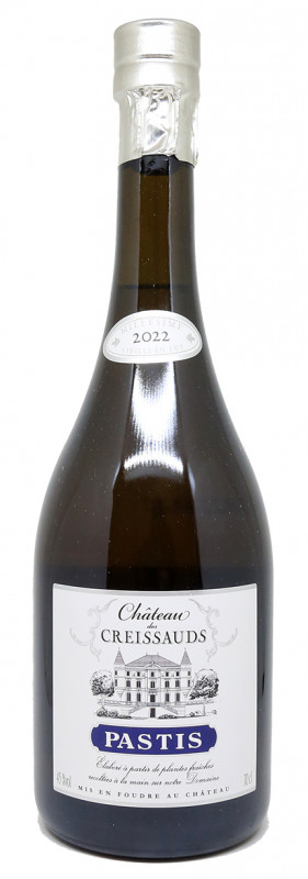El Pastis del Château des Creissauds se elabora con plantas frescas procedentes de las 7 hectáreas de la finca. Estas plantas aromáticas se complementan con plantas mediterráneas cultivadas en los jardines aromáticos del castillo. Tras una cosecha manual que dura de abril a octubre, las plantas se maceran en Dame-Jeanne en alcohol extrafino. Cada planta se macera por separado antes de ensamblarlas y luego colocarlas en barricas de roble durante un año. A continuación se extrae el destilado y se añaden esencia de regaliz y anís antes de reducirlo al grado final.