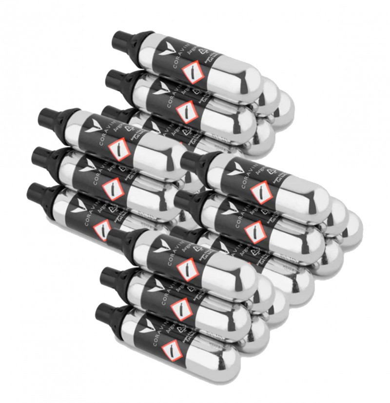 Coravin Pure Argon Capsules power the Coravin Timeless and Pivot wine preservation systems. They are filled with pure Argon gas that pressurizes the bottle to allow wine to flow through the pour spout, then covers the remaining wine once the system is removed. Each capsule pours up to 15 x 150ml glasses of wine with the Timeless systems or 20 x 150ml glasses with the Pivot systems.