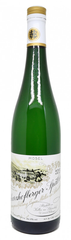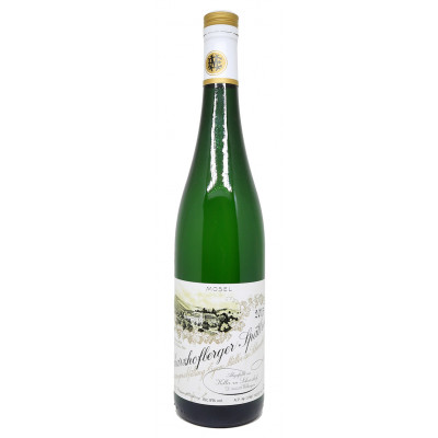 The Scharzhofberger comes from Riesling vines located in Wiltingen, far from the Saar in a side valley and facing south. The slopes of the vineyard are quite steep (30 to 60%) and high, between 180 and 280 meters above sea level. Formed of grey Devonian slate, the soils are very deep and without bedrock. Spätlese means "Late Harvest" and is made from grapes that have a must weight of 76-90 Oechsle (the hydrometric scale measuring density grape must) which is equivalent to 172-209 g/L of residual sugar.