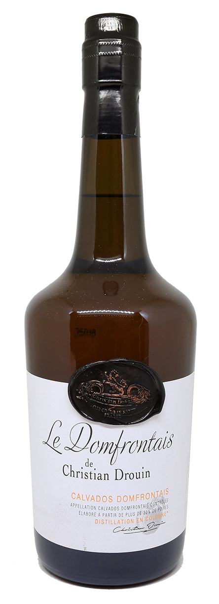 O Domfrontais de Christian Drouin é uma mistura de Calvados envelhecidos de 3 a 5 anos em pequenos barris de carvalho. A originalidade do Calvados de denominação Domfrontais reside na sua alta percentagem de peras para aguardente de pera e na sua destilação simples em alambique de coluna. As pereiras da região de Domfront, por vezes centenárias, são grandes árvores que produzem pequenos frutos com aromas subtis e acidez fresca. Estas peras (cerca de 60% da mistura, com as maçãs) conferem frescura, elegância e crocância a um Calvados particularmente frutado.