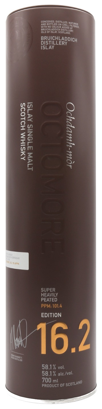 Octomore 16.2 – Editie 2025 – 58,1 % gebruikt dezelfde partij Schotse gerstemout met 101,4 ppm, maar verandert radicaal van koers door het gebruik van vaten. Het rijpt eerst in een selectie van Oloroso en Bordeaux vaten, voordat het wordt afgewerkt in Portugese Madeira en Moscatel vaten, een constructie die is ontworpen om reliëf, zoetheid en diepte te brengen zonder de rook te doven. Deze editie is dus geen "Octomore met rode wijn" in strikte zin, maar een cuvée gebouwd op een dialoog tussen versterkte wijnen, Bordeaux-invloed en beheersbare turf. Het resultaat zoekt de balans tussen gulzigheid, spanning en kampvuurrook, met een complexiteit die kruidiger en patisserie-achtiger is dan de 16.1. Het is een meer "vatgedreven" interpretatie, maar nog steeds coherent en leesbaar.