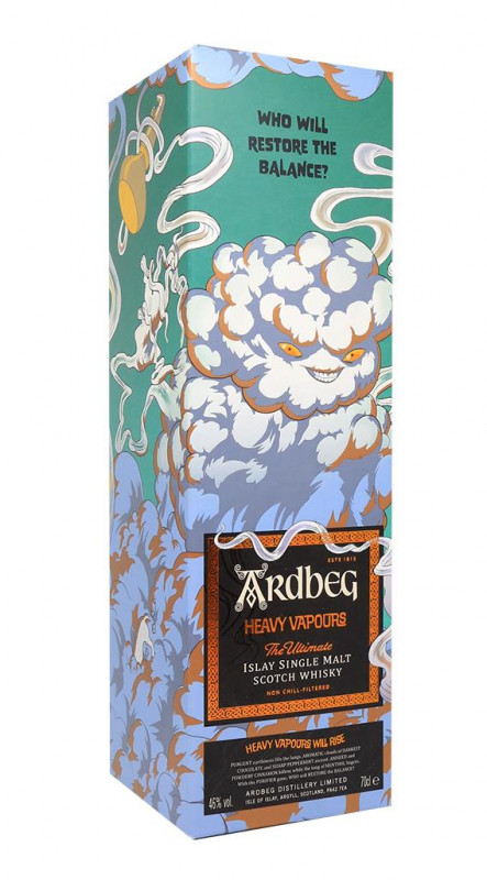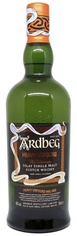 Ardbeg Heavy Vapors es una edición limitada destilada sin usar el purificador de Ardbeg . Por norma general, los vapores que suben en el alambique son captados por este equipo: capta los compuestos más pesados y los condensa, haciendo que vuelvan a caer en el alambique. Los vapores vuelven a caer en el alambique, se calientan de nuevo y vuelven a subir. Se dice que este proceso de purificación aporta una fruta floral que equilibra la poderosa turba, pero esto se ha evitado aquí para dar al whisky Ardbeg notas y sabores más oscuros y salvajes. Fue envejecido en barricas ex-Bourbon .