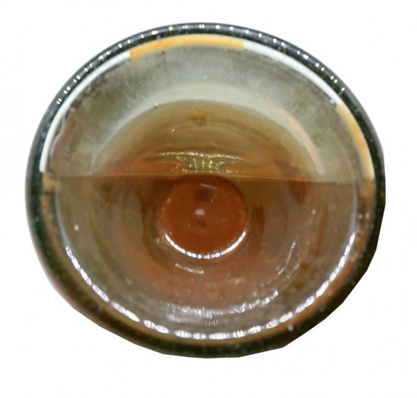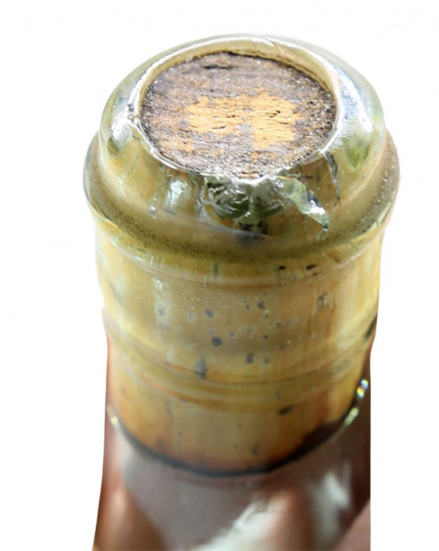 Le bouchon de liège (tapon corcho) est en parfait état. La cartouche présente une étiquette en losange reprenant le logo « CAR » de la pastille. L’étiquette est dérivée du modèle de 1904 avec mention « Une Tarragone » et contour « petit beurre ». Il est également mentionné « Liqueur fabriquée par les Pères Chartreux » sur fond jaune animé de croisillons.
