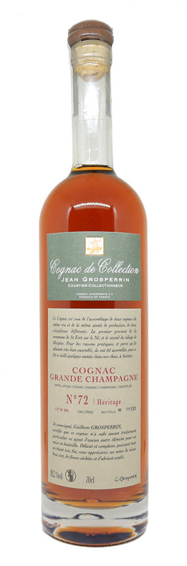 Ce Cognac Grande Champagne No.72 est issu de l’assemblage de deux Cognacs du même cru et de la même année de production, de deux viticulteurs différents. Le premier provient de la commune de Saint-Fort sur le Né, et le second du village de Merpins. Ils ont été assemblés puis le fût a été vieilli dans les chais de Grosperrin à Saintes.