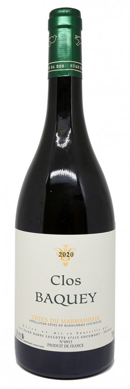 Clos Baquey est un assemblage de Cabernet Franc (35%), Merlot (35%), Abouriou (15%) et Cabernet Sauvignon (15%), issus d’une seule parcelle exposée au Sud. Les Cabernet Franc, Cabernet Sauvignon et Merlot sont entièrement égrappés et vinifiés en cuves bétons ouvertes avec de légers pigeages et une macération durant de 2 à 3 semaines. L’Abouriou est encuvé en grappes entières mais pas vinifié en macération carbonique. Chaque cépage est vinifié puis élevé séparément. L’élevage est réalisé en pièces pendant 22 mois, le vin est transféré en cuve béton pendant 12 mois, suivi d’un vieillissement supplémentaire en bouteille pendant 12 mois.