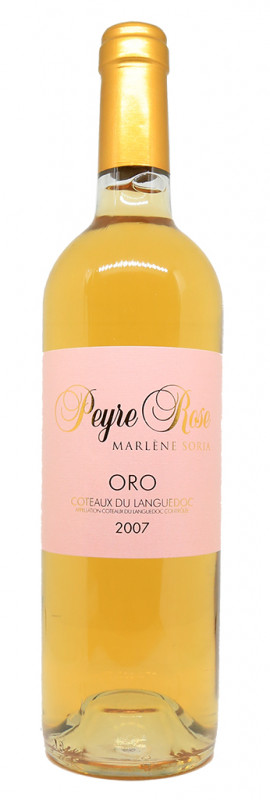 Oro est le vin couleur d’or de Marlène Soria, baptisé d’après un dieu polynésien en hommage à son fils qu’elle a adopté à Tahiti. C’est un assemblage de Rolle (70%), Roussanne (25%) et Viognier (5%). Ce blanc sec est élevé pendant plus de 10 ans, en cuve et en foudre avec un affinage en bouteille. Le millésime 2007 dans le Languedoc est considéré comme excellent malgré la sécheresse. La vigne s’est adaptée au climat et a pu produire des raisins en excellent état sanitaire, très avec une forte concentration.