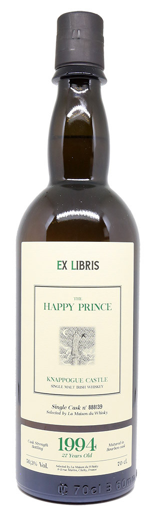 Knappogue Castle « The Happy Prince » est un whiskey de 27 ans distillé en 1994. Après une triple distillation, ce Single Malt est vieilli dans un fût de Bourbon. Ce fût unique (#888139) a produit 175 bouteilles.