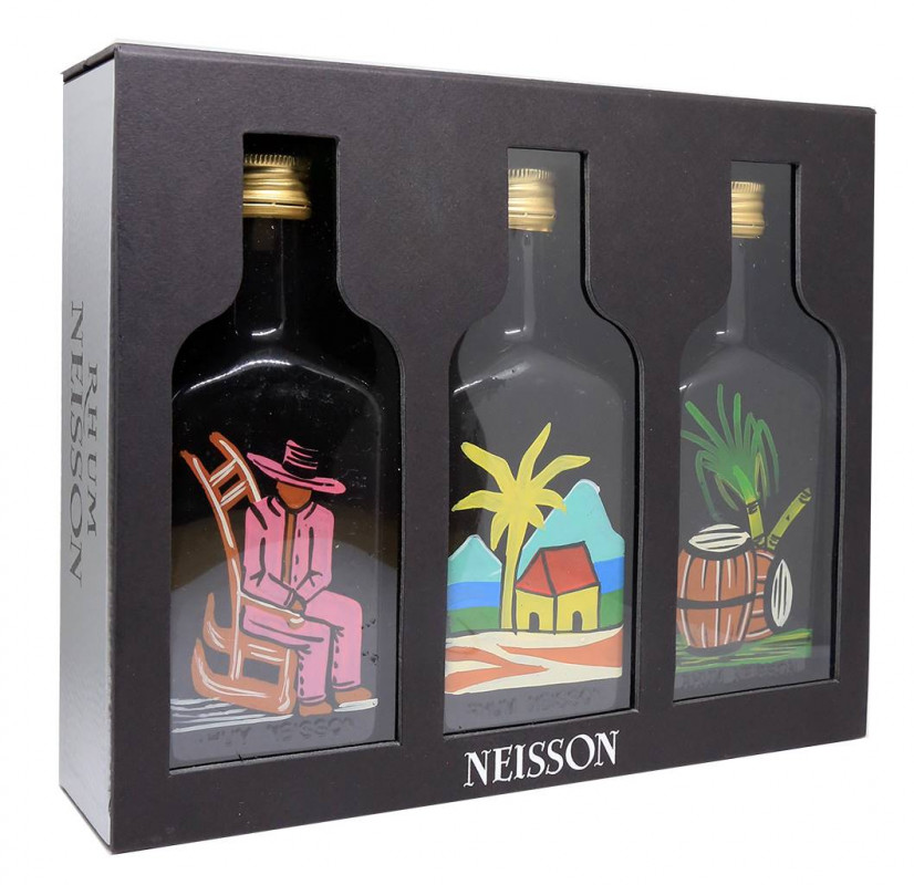 Ce petit coffret présente 3 bouteilles de 20cl de rhum Neisson Blanc à 50% avec 3 oeuvres originales de Tatanka peintes à la main. Ce coffret était uniquement disponible sur place à la distillerie.
