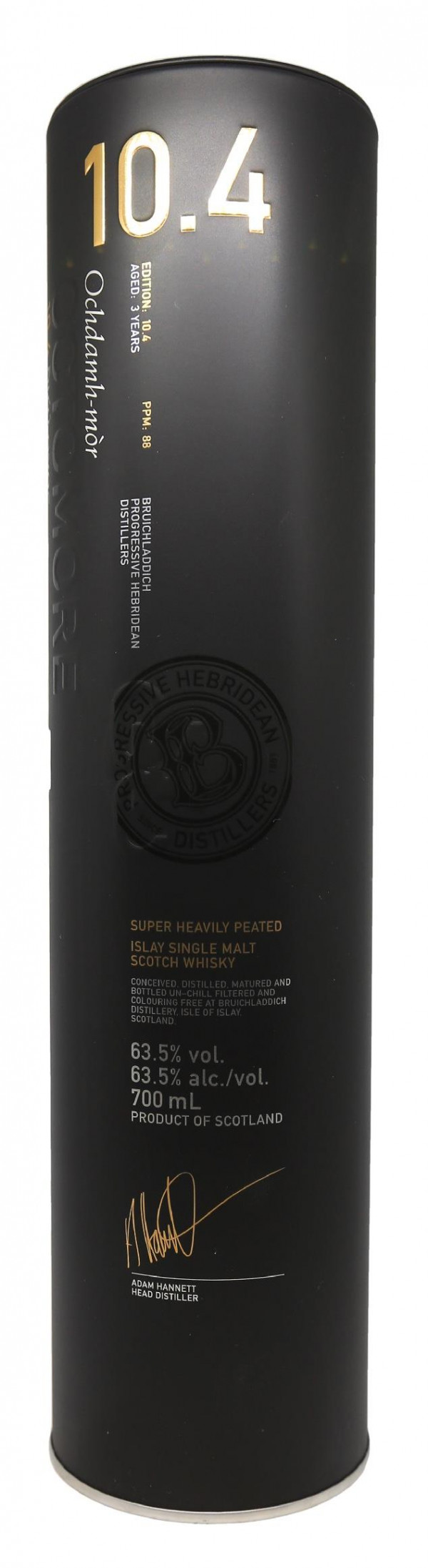 The Octomore 10.4 a été distillé en 2016 à partir de la récolte 2015 d'orge écossais de la variété Concerto. Il a été entièrement vieilli pendant 3 ans en chêne vierge français. Les vingt-huit fûts taillés en chêne du Limousin ont été soumis à un toast élevé avant d’être mis à l'entrepôt 12 pour le remplissage. Cette édition limitée a produit 12.000 bouteilles.
